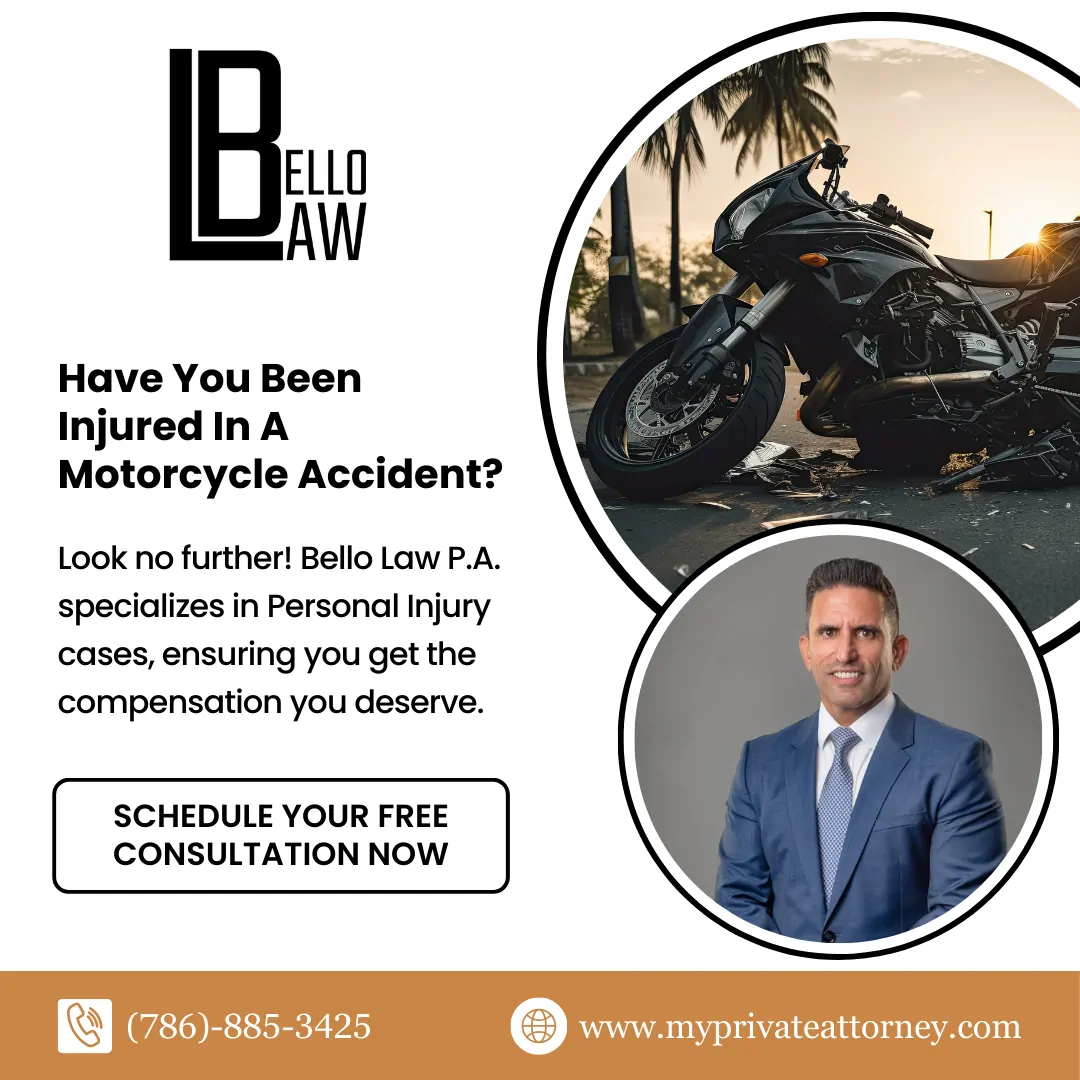 Let Bello Law P.A. stand beside you after your motorcycle crash. Our experienced Motorcycle Accident Lawyer in Miami Beach fights for your recovery with skill, urgency, and compassion. We handle every legal detail so you can heal with peace of mind. Call now for a free consultation and take the first step toward justice.